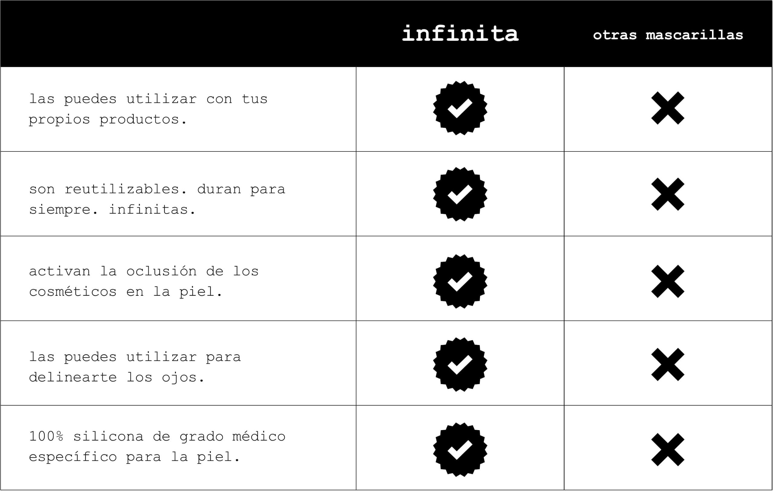 mantienen los sérums y las cremas en tu piel evitando su evaporación haciendo que tu piel absorba por completo los activos de tus propios productos. tus productos serán mucho mejores de lo que lo son ya.lo mejor es que son reutilizables y duran para siempre.están inspiradas en los muchos beneficios que la piel encuentra en el agua de mar. para tener una piel bonita, con efecto vida infinita en el mediterráneo.nuestra tecnología permite activar la oclusión en tu piel. la oclusión es el bloqueo de la evaporación de tus cosméticos al contacto con el aire.activando la oclusión en tu piel extraes el máximo beneficio de cada uno de los activos que hay tus propios cosméticos.con infinita absorverás al máximo y potenciarás los activos, nutrientes y minerales que tienen tus propios productos.mejorarás la salud, suavidad y el aspecto de la piel, reducirás la inflamación, y aumentarás la elasticidad y la firmeza de la piel.también te ayudrán a reducir la aparición de imperfecciones y arruguitas.